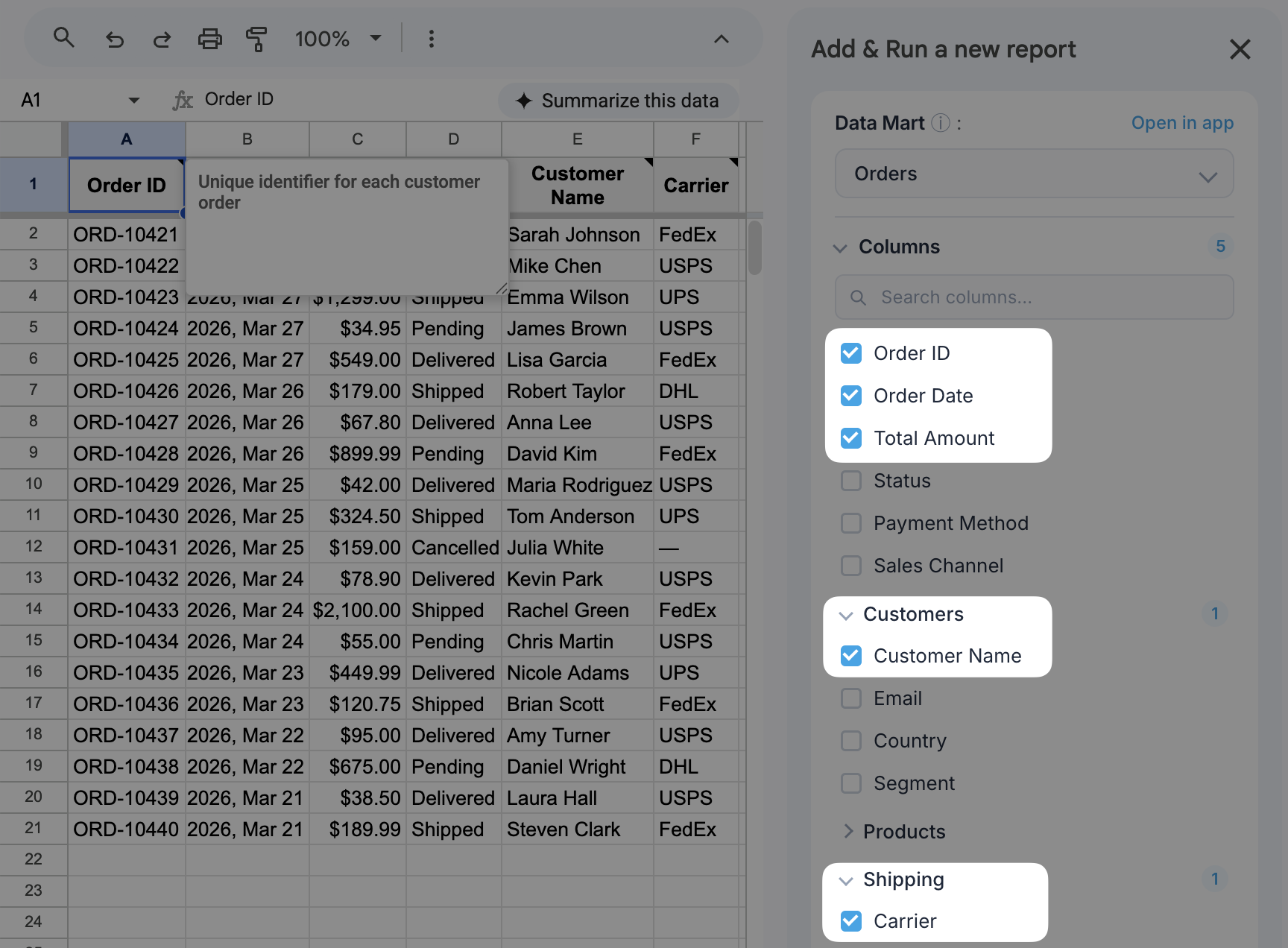 Never get blamed for a number you didn't write. One click reveals the exact SQL behind every cell. You define the data marts and rules; the agent only serves what you've approved.