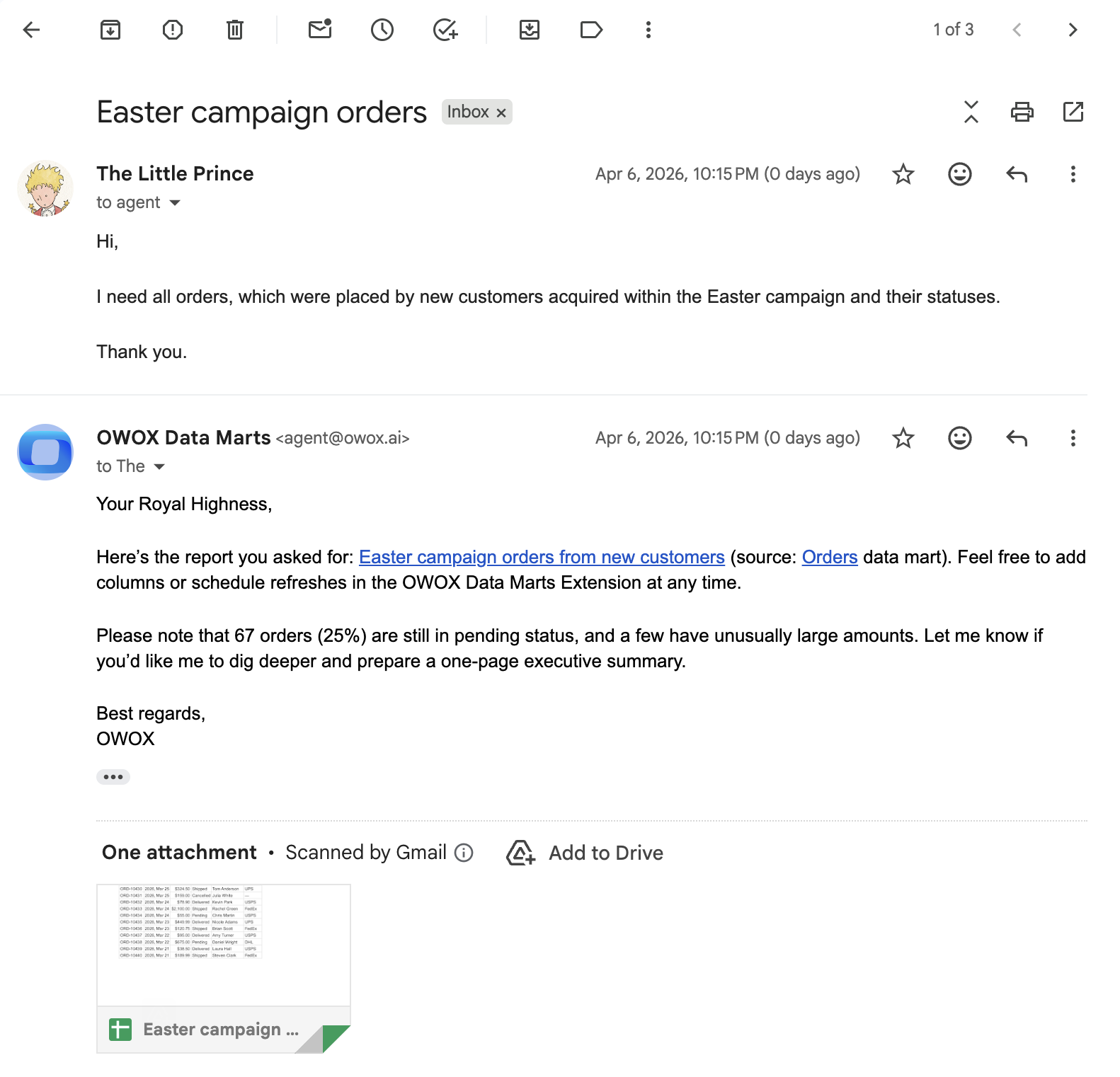 Email agent@owox.ai and get a live spreadsheet back in minutes. No ticket. No waiting. No back-and-forth