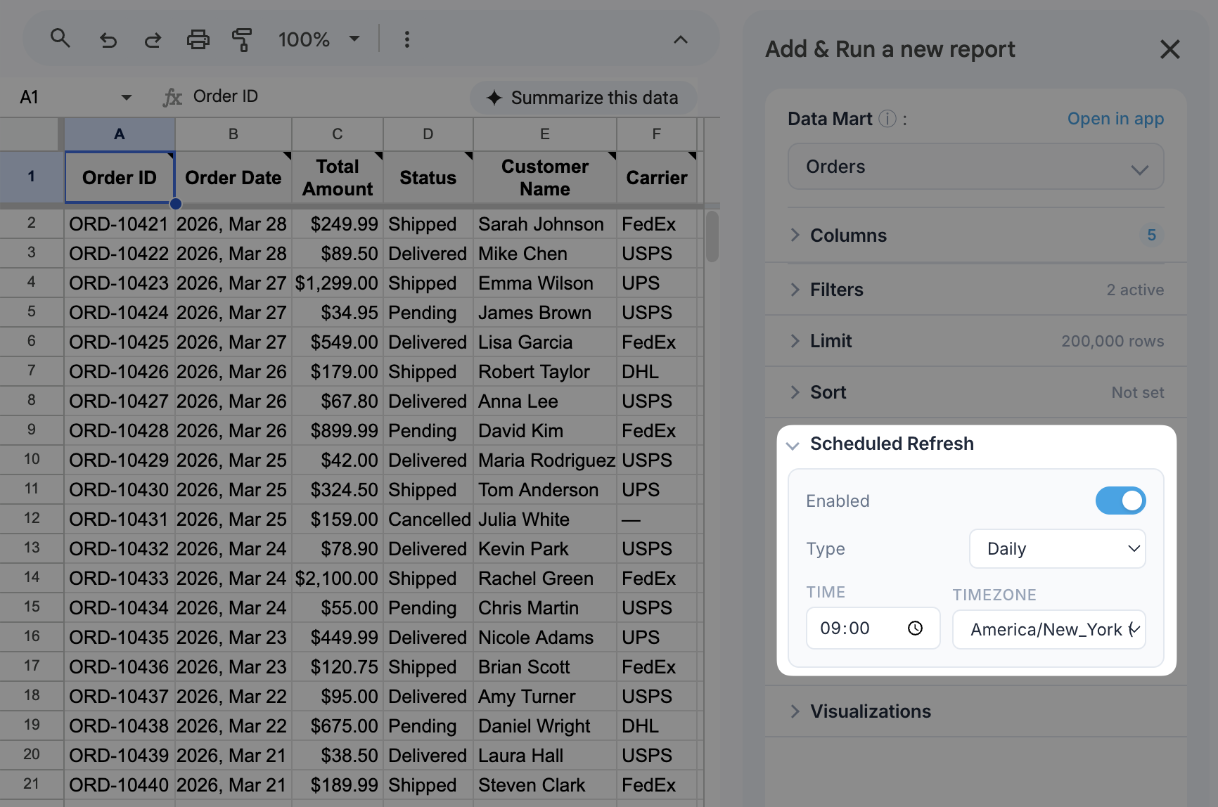 Schedule refreshes, apply filters, and keep your data live and connected to trusted sources